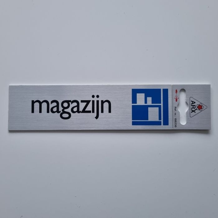 De bordjes zijn voorzien van een geborsteld aluminium look. Met de tekst: magazijn en een pictogram ernaast.